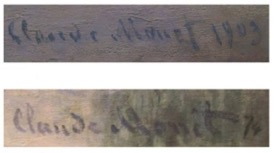 Например, ниже приведен набор подписей художника Клода Моне, демонстрирующий, как аналитики, занимающиеся почерком, будут иногда ссылаться на подпись художника по прошлым картинам и личным документам, чтобы проверить происхождение авторства произведения искусства.