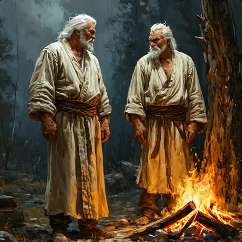 Среди темноты я увидел большой костёр. Вокруг него стояли седовласые, крепкого телосложения мужчины. Они были одеты в бежевые мантии. Позади каждого старца возвышалась трёхметровая каменная плита, шириной где-то с метр. На них были выгравированы незнакомые знаки.