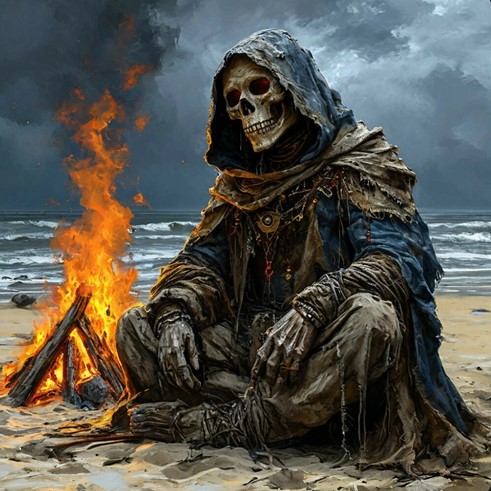 Мы с Сергеем сели прямо на песок с противоположной стороны костра. В свете огня его маска выглядела ещё более ужасно. От него исходила сила, что пугала и притягивала одновременно. Он резко сорвал нитку с небольшим тряпочным мешочком со своей шеи и кинул в пламя. Огонь поменял свой цвет сначала на зелёный, потом на фиолетовый, а после резко погас. Мужчина достал из-за пазухи кусок ткани. Положил перед собой. Из костра взял уголь и начал выводить им линии. Я попытался рассмотреть рисунок, но в темноте это плохо вышло. Он закончил рисовать.
