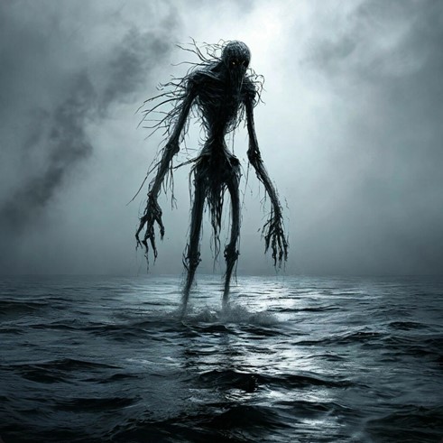 Она сделала всё, как он объяснил, и камень трижды отскочил от поверхности воды, оставив едва заметный след. Но в том месте, где он утонул, вдруг закипели тёмные пузыри. С глубины на поверхность поднималась густая чернота нефти. Эта масса, будто живая, собиралась в какую-то странную фигуру. Сначала она приняла очертания огромной головы, словно выныривающей из самой бездны. От неё вылезли две неестественно длинные руки, похожие на чёрные щупальца, что тянулись вверх почти на пару метров и стремились захватить всё вокруг. Дальше из воды поднялось трёхметровое тело, которое раздвоилось снизу. Фигура приобрела форму, напоминающую человека, но это было нечто вовсе нечеловеческое, состоящее из густой, липкой массы, даже на таком расстоянии источающей зловоние и тьму.