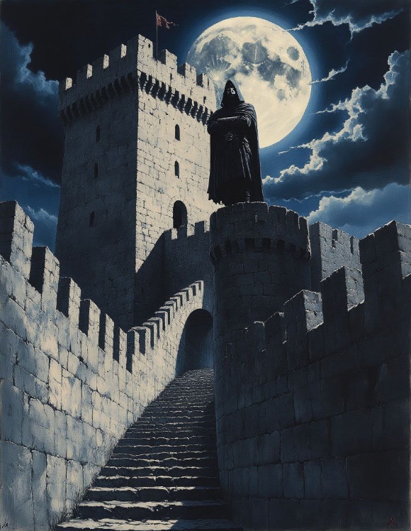 Вдруг уже начавшее переправу турецкое войско внезапно замерло и остановилось. На другом берегу из ниоткуда возник темный, почти черный рыцарь на великолепном коне. Казавшийся огромным витязь молча смотрел на непонятно от чего замерших османов, а затем поднял вверх сверкнувшую как молния булаву. Тут же как будто из-под земли за ним возникли могучие конные воины, вставшие каменными стенами справа и слева от своего вождя, у которого вместо господарского шестопера в руках появился шитый золотом штандарт.