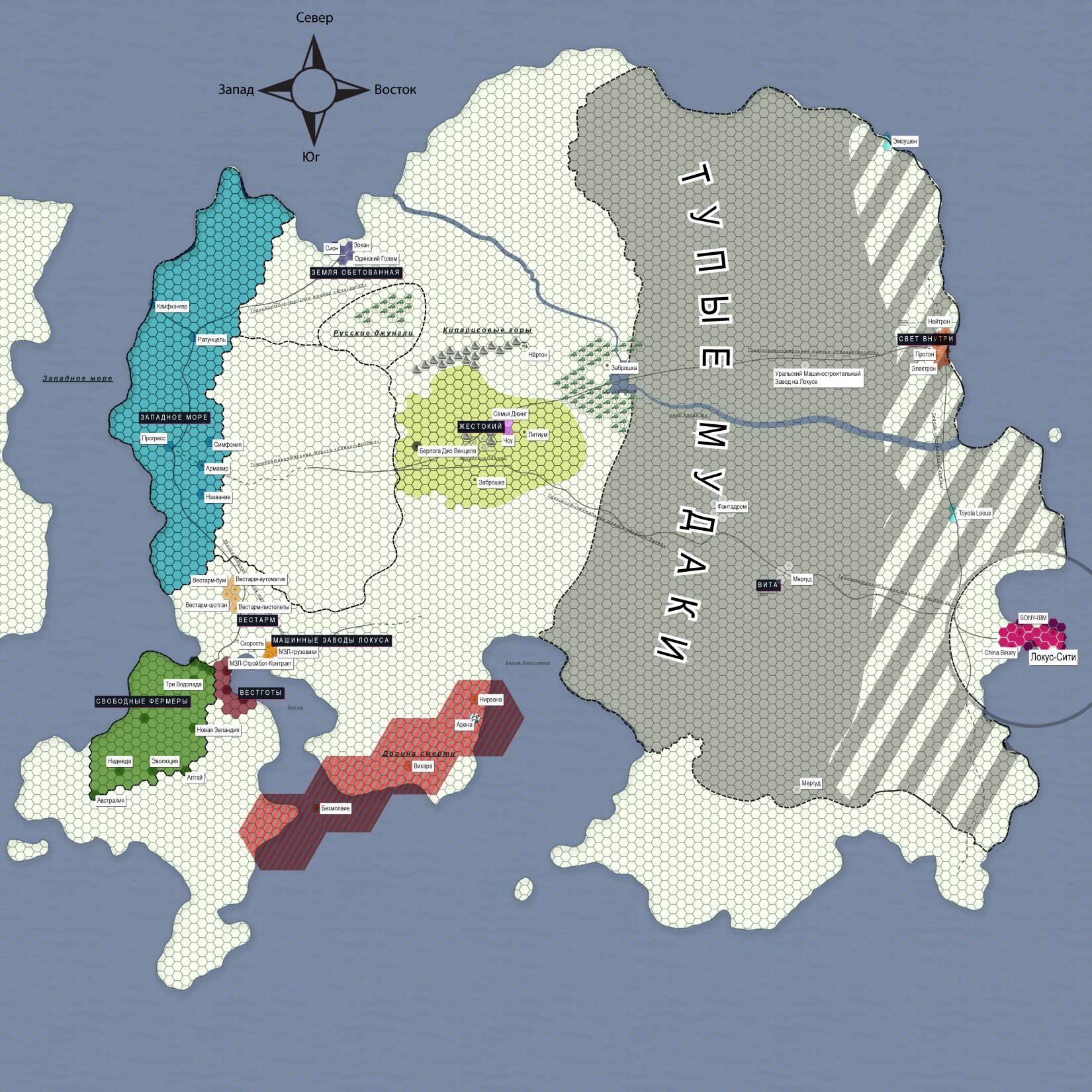 Вся восточная часть карты была залита серым цветом. Под этим слоем виднелись многочисленные отдельные гексагоны и их экономические зоны. Но все они обведены пунктиром, видимо, помечены как захваченные. Серая территория на карте была лаконично подписана: «Тупые мудаки».