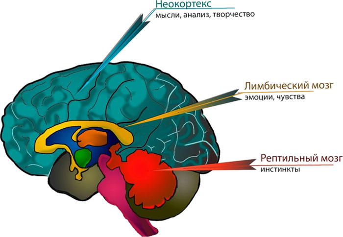Первый отдел – наш рептильный мозг. Самая древняя часть мозга, отвечающая за инстинкты. Все желания и базовые потребности происходят оттуда. Они просты до невозможного. Существо, обладающее рептильным мозгом, способно: убегать, сражаться, есть, спать, спариваться. Вся работа этой части мозга направлена на удовлетворение базовых потребностей.