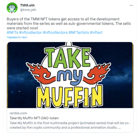 После успешного сотрудничества с Toonbox в создании анимационного сериала «Хомяки против быков» мы с радостью объявляем о своей роли генеральных консультантов в новом революционном анимационном сериале NFT "Take My Muffin». (Take My Muffin – это первый в истории интернета анимационный сериал 18+ (для взрослых), который создается полностью при финансовой поддержке криптосообщества через продажу токенов NFT, криптопартнерства и продажу крипто-токенов самого сериала. Проект был официально запущен 19 апреля 2021 года, о чем свидетельствует исторический твит: