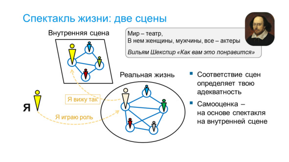 Как говорил Вильям Шекспир: «Мир – театр, В нем женщины, мужчины, все – актеры». Не тривиальным является то, что сцен две: есть спектакль, который происходит в реальном мире, и есть отражение и предвосхищение этого спектакля у нас в голове. Подчеркнем: внутренняя сцена не только отражает настоящее и прошлое, на ней происходит предвосхищение будущего – фантазии и планирование новых действий происходит до того, как они развернуться в реальном мире. Но о планировании будущего мы поговорим позднее, а сейчас сосредоточимся на режимах отражения текущей ситуации и рефлексии над прошлым.