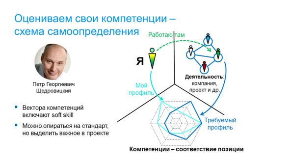 Например, умение лавировать в конфликте интересов разных стейкхолдеров проекта и проводить мягкий арбитраж может являться необходимым умением для руководителя проекта и аналитика. А формулироваться это может не слишком внятными словами: «понимаешь, у нас сложный заказчик…». А для профиля это означает, что должна быть отдельная ось компетенций, соответствие по которой надо оценивать.
