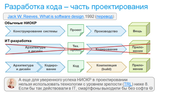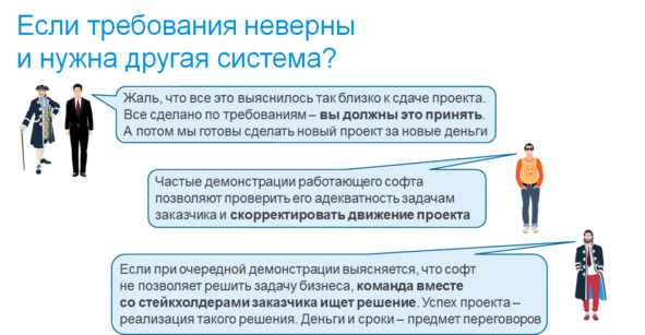 Мы рассматриваем конструкцию Agile, так же упомянув о развитии и провале регулярного менеджмента в управлении IT-проектами. Во-первых, для того, чтобы вы понимали, где и почему они не сработали в IT, и могли оценить – изменилась ли с приходом цифрового мира ситуация у вас в отрасли так, что регулярный менеджмент тоже перестает работать. В во-вторых, чтобы выступая как заказчик IT-проектов, вы могли оценить уместность классических методов. Потому что, несмотря на многолетний опыт отрасли, показывающий ограниченность методов регулярного менеджмента, светлая идея проектов, сделанных «качественно и по уму в настоящей инженерной культуре» продолжает быть крайне привлекательной. Культуры уходят, а учебники остаются, и часто используются для обучения молодежи, в и результате получается эклектика несогласованных концепций, противоречащих друг другу. Культуры уходят, а учебники остаются, и часто используются для обучения молодежи, в и результате получается эклектика несогласованных концепций, противоречащих друг другу.