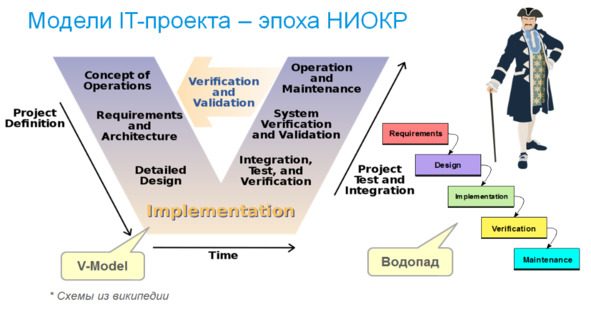 Итак, эпоха НИОКР. На заре IT, когда компьютеры были большими и стояли в только научных центрах, университетах и крупных корпорациях, разработка софта была похожа на опытно-конструкторские разработки, да еще со значительной исследовательской составляющей. Целью проекта было создание совершенной системы в единственном экземпляре. И выполнялись методами, характерными для НИОКР. Тогда была разработана принципиальная схема V-модель для описания этапов процесса разработки и ее разомкнутая линеаризация в виде водопадной модели (Ройс, 1970). Отметим, что итерации обратной связи, которые представлены на V-модели, принципиально отличаются от современных итераций большой длительностью и тщательной проектированием системы. Ни о каком выделении минимального продукта (MVP) речи не шло, проекты длились годами. А условия для большинства из них были стабильными, потому что речь шла о расчете физических процессов, таких как полет ракет и самолетов, которые происходят по неизменным законам.