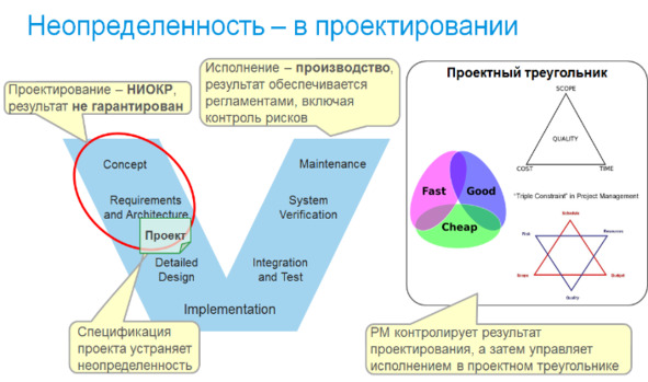 Собственно, в чем смысл подхода проектного управления? В том, чтобы всю неопределенность движения по V-диаграмме перенести на стадию проектирования, а то, что не получается – явно выделить как риски, оставив на стадии разработки только типовые операции с предсказуемой трудоемкостью. Тогда после завершения проектирования ход разработки становится предсказуемым, и менеджеры смогут управлять им в классическом треугольнике объем (scope) – сроки – стоимость в одном из его вариантов.