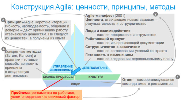 Каким же образом Agile удалось ответить на вызовы организации умственного труда и разработке для VUCA-мира? А очень просто: раз ключевым фактором успеха IT-проектов является человеческий фактор, значит не надо ставить на процессы, а надо сделать ставку на команду, которая сама организует свою работу. А чтобы команда объединилась в движении к общим целям, необходимы ценности, которые послужат основой. Так появился Agile-манифест (2001) (на русском). Заметим, что ответ ассиметричный: проблема лежит в области процессов, а решение – в области культуры. Это явно видно на схеме, приведенной ниже, где конструкция Agile помещена на схему кораблика.