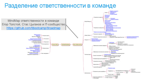 Отметим, что развитие IT показало, что при сохранении принципиального разделения ответственности за продукт и за организацию, детальное разделение ответственности в разных компаниях отличается очень сильно. Недавно Егор Толстой и Стас Цыганов организовали в IT-сообществе сбор полного MindMap управленческой ответственности команды, результаты опубликованы на GitHub и доступны. В статье – картинка, а по ссылке можно скачать себе полный mindmap и внести свой вклад в обсуждение. И хотя эта работа сделана на материале IT-отрасли, в ней много общезначимых пунктов и вы можете подумать о применении его в рамках своей отрасли, выполнив адаптацию сами или организовав аналогичное обсуждение в профессиональном сообществе. А потом – подумать о том, как ответственность разделяется в вашей компании: что находится внутри команды и как именно распределено, что передано руководителю следующего уровня, за что отвечает инфраструктура и техноструктура, увидеть упущенные или провисающие фокусы ответственности.