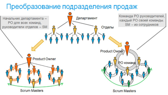 Так вот, при agile-трансформации большого департамента продаж, состоящего из нескольких отделов, есть два существенно различных варианта, изображенных на схеме. Если у вас в компании стратегией продаж занимается руководитель департамента, который при этом обычно является директором по продажам или занимает аналогичную должность, а руководители отделов лишь организуют работы сотрудников, то директор по продажам становится Product Owner для всех команд, а руководители отделов – скрам-мастерами. А если отделы продаж работали достаточно автономно, например, по сегментам рынка или разным продуктам, и ответственность за выбор направлений по каждому направлению была на руководителях отделов, то именно они могут стать Product Owner, образуя управляющую продажами команду в стиле Scrum of Scrum, а скрам-мастеров при этом надо выбирать внутри команд. Тщательная работа с культурой сотрудников будет нужна в любом случае, впрочем об этом я уже говорил.