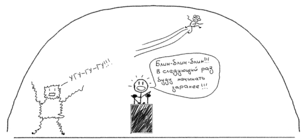 Как пишет Тим Урбан, наша обезьянка живет по законам обезьяньего мира, в котором ты успешная обезьяна, если ты ешь, когда хочешь есть, спишь, когда хочешь спать, и не делаешь ничего, что нельзя назвать веселым. Единственный, кого боится обезьянка, – это панический монстр (я безумно люблю Тима Урбана за его креатив). Панический монстр появляется незадолго до дедлайна или в любой другой момент, когда возникает угроза жизни, утраты лица или просто большой неудачи. Завидев панического монстра, обезьянка сбегает, оставляя у пульта рационального коллегу, и тот в панике в ночь с пятницы на понедельник ликвидирует опасность. Обычно он худо-бедно, ценой невероятных моральных и физических усилий успевает впритык к назначенному сроку, клянется, что больше такого не повторится и что в следующий раз он будет начинать все делать заранее. Но стоит паническому монстру только уйти, как обезьянка занимает свое привычное место у пульта управления и с этого момента все попытки рационального человека начинать делать важные дела заранее обрекаются на неудачу.