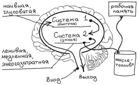 Согласно модели Канемана, наше сознание – это две системы, в его книге они так и называются: Система 1 и Система 2. Информация, поступающая в наш мозг от органов чувств, попадает в Систему 1, которая работает автоматически и почти «бесплатно» с точки зрения энергетических затрат. Система 1 вырабатывает определенное решение и передает это решение Системе 2. Система 2 – это наше медленное, но умное мышление. В отличие от Системы 1, она способна решать сложные задачи, но на этом ее преимущества заканчиваются. Система 2 – тяжелый, ленивый и неповоротливый инструмент. Получив от Системы 1 вариант решения, Система 2 может вмешаться, заменив его на другое, а может и оставить это решение в первоначальном виде и выдать его в качестве окончательного в виде нервных импульсов, которые уже заставят наше тело шевелиться, а сознание – думать «в определенную сторону».