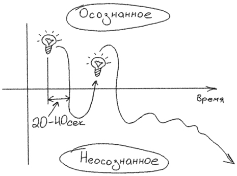 Что характерно, большинству людей довольно тяжело удерживать внимание на одном объекте или думать одну и ту же мысль больше, чем несколько минут. А удержать гениальную идею в рабочей памяти редко удается дольше 20–40 секунд[18]. Более того, если вы будете специально стараться удержать эту мысль в сознании, вы выключите свою способность мыслить. (Помните? Это описывалось в параграфе 1.3.)