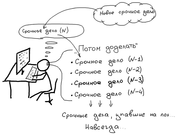 В этом случае срабатывает правило «Кто последний, тот и важный», в результате новое и нетронутое становится важнее начатого и недоделанного – получаем механизм стека (рис. 12). Если человек к тому же неспособен вести аккуратный список задач (а часто он этого не делает, чтобы «сэкономить время»), то весь стек прерванных заданий удерживается в голове, к чему она не приспособлена. Все, что в этот стек не помещается, «падает на пол», образуя все возрастающий слой недоделанного. В итоге получается, что если вы написали письмо, то с большой вероятностью через 30 секунд получатель уже начал писать ответ. И если через десять минут ответ не пришел, значит, за это время он получил еще 3–5 писем, которые вытеснили из стека недописанный ответ на ваше.