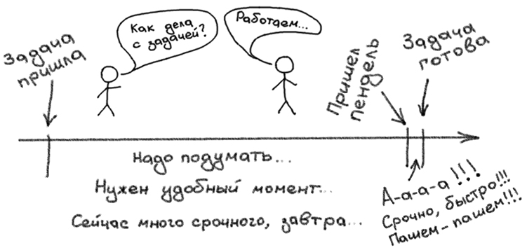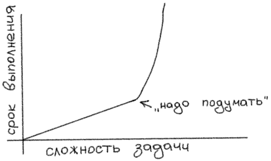Возможно, вы замечали, что, по странному стечению обстоятельств, задача трудоемкостью в половину человекочаса (условных, конечно) выполняется за полчаса, задача в один человекочас – за один час, в два человекочаса – за два часа… Но в какой-то момент наступает перелом: на задачу в четыре человекочаса уходит целый день, на задачу в восемь человекочасов – неделя, а задача в сорок человекочасов не доводится до конца практически никогда.
