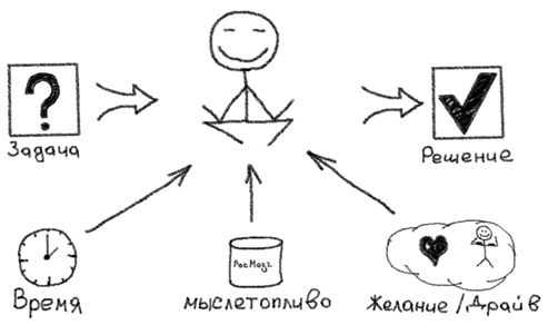 И тут возникает интересная ситуация. Если мы относим свой труд к категории умственного[15], то должны понимать, что для решения задач и доведения дел до конца нам нужно не только время. На самом деле нам нужно еще и мыслетопливо, а также некий ресурс, обозначающий наши желания, склонности, стремления. Как правило, у нас есть и время, и свежий мозг, но одну задачу хочется делать, а другую нет. В небольших пределах мы можем компенсировать недостаток одного ресурса за счет других, например, если у нас нет желания делать что-то, мы можем потратить больше времени и «залить» задачу мыслетопливом, затраченным на «принуждение себя». Или, если у нас мало времени, но мозг свеж, а желание выполнить задачу огромно, то с большой вероятностью мы сможем с ней справиться в отведенный срок.