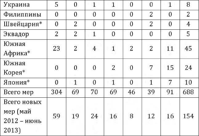 Таблица 2. Потенциальные меры, ограничивающие торговлю, за октябрь 2008 – июнь 2013 года