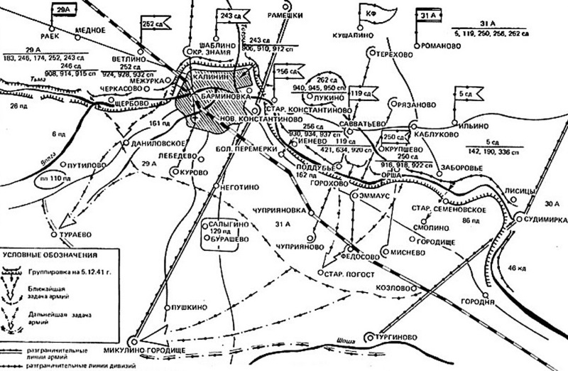 5. 29 А (183, 174, 246, 252, 243 сд) продолжая упорно обороняться на ТОРЖОКСОМ и МЕДНИНСКОМ направлениях, 4.12.41 246, 252 и 243 дивизиями, во взаимодействии с 31 А, наступать в направлении ДАНИЛОВСКОЕ, овладеть КАЛИНИН и в дальнейшем наступать в направлении ТУРАЕВО.