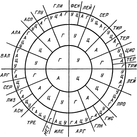 А к 1967 году расшифровка генетического кода была окончательно завершена. Этот код изображен на рис. 7. В центральном круге таблицы обозначены первые нуклеотиды кодонов, в следующем – вторые, а затем – третьи. На внешней части круга указаны соответствующие кодонам аминокислотные остатки.