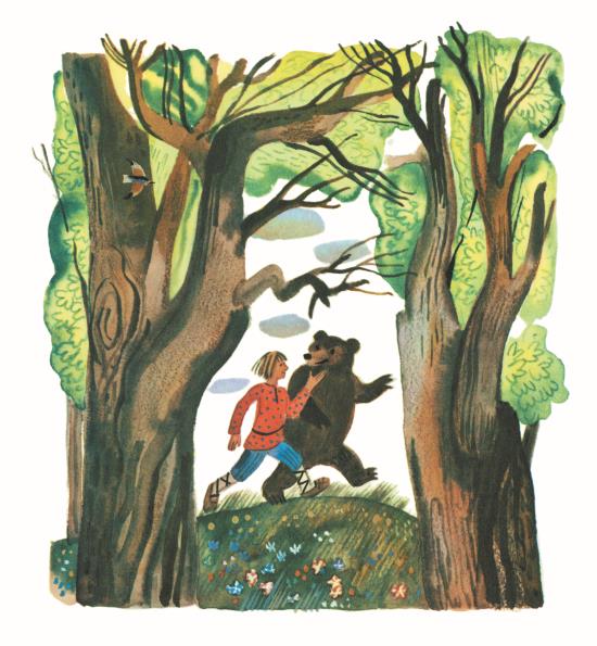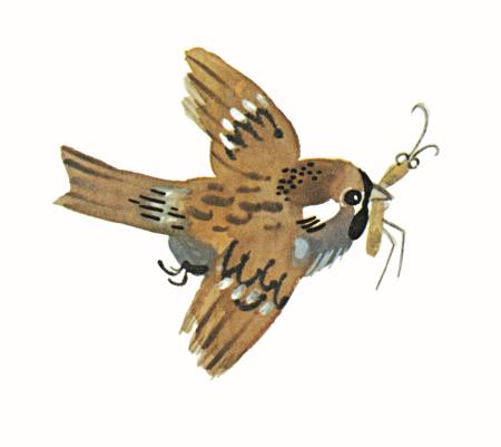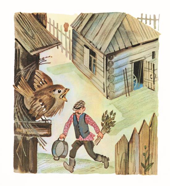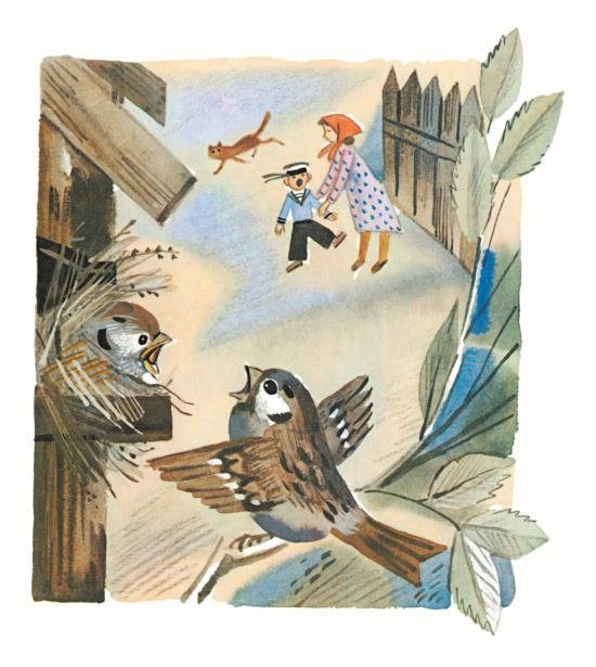 Эх, бескры́лый челове́к,У тебя́ две но́жки,Хоть и о́чень ты вели́к,Едя́т тебя́ мо́шки!А я ма́ленький совсе́м,Зато́ сам мо́шек ем.Пел, пел да и вы́валился из гнезда́, а воробьи́ха за ним, а ко́шка – ры́жая, зелёные глаза́ – тут как тут.