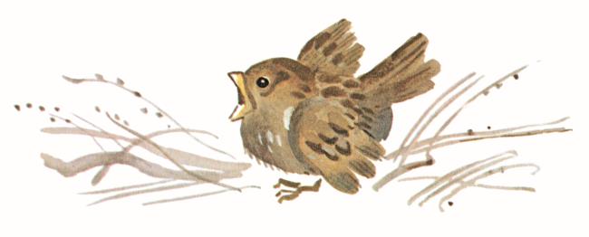 Испуга́лся Пу́дик, растопы́рил кры́лья, кача́ется на се́реньких нога́х и чири́кает: