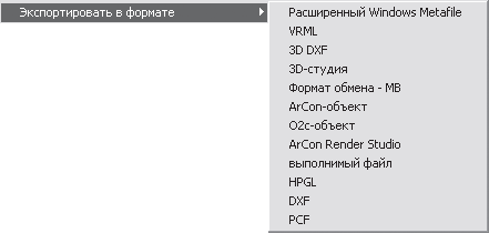 Забегая наперед, скажу, что проекты ArCon+ 2005 можно экспортировать в различные как двухмерные, так и трехмерные форматы, используя группу команд Файл → Экспортировать в формате (рис. 1.2). Важно отметить, что в программе поддерживаются такие известные форматы обмена данных, как VRML, DXF, формат системы 3ds Max, а также возможность сохранения проекта в выполнимый EXE-файл (подробнее об этом написано далее).