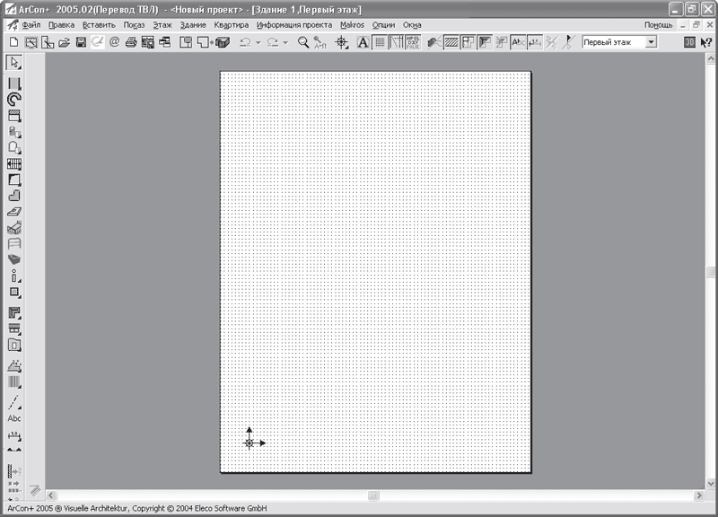 После задания настроек проекта (в окне Свойства этажей необходимо нажать кнопку ОК) открывается документ с пустым листом (чертежом) плана, а главное окно программы при этом должно значительно преобразиться и выглядеть, как на рис. 1.4. Кроме того, системное меню значительно пополняется новыми разделами.