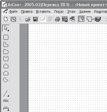 Главное окно программы ArCon 2005, открываемое сразу после запуска, показано на рис. 1.3. Оно содержит только две панели инструментов (одну вертикальную и одну горизонтальную) и три пункта меню, управляющих системными настройками и настройками нового проекта. Пока на панелях инструментов активны всего лишь три кнопки, позволяющие создать новый проект, запустить мастер проектов, называемый в программе Ассистент проектов, или открыть (загрузить) ранее сохраненный проект.