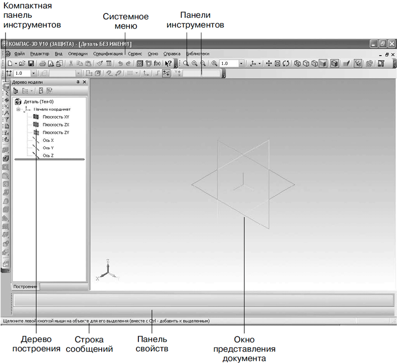 Для детального знакомства с интерфейсом программы стартовой страницы явно недостаточно, поэтому выберите в диалоговом окне Новый документ тип файла Деталь и нажмите кнопку OK (или просто воспользуйтесь ссылкой Деталь на стартовой странице программы). Система создаст новый документ КОМПАС-Деталь, при этом главное меню и панели инструментов изменятся (рис. 1.4).