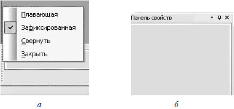 Для изменения состояния панели, то есть для ее закрепления или перевода в плавающее состояние, следует воспользоваться контекстным меню. Если панель свойств расположена горизонтально, то контекстное меню можно вызвать, щелкнув кнопкой мыши возле вертикального маркера из точек в ее левой части (рис. 1.6, а). Если панель находится вертикально, то для установления или снятия фиксации служит кнопка с изображением канцелярской кнопки в правом верхнем углу панели (рис. 1.6, б).