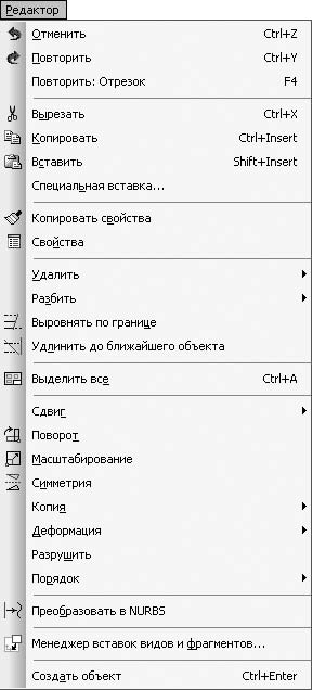 Меню Редактор при активном графическом документеКоманды меню Редактор при активном графическом документе (рис. 1.8) предоставляют различные способы для редактирования графических объектов в документе, включая как простые примитивы (точка, отрезок, дуга и пр.), так и сложные составные объекты (макроэлементы, фрагменты и т. п.).