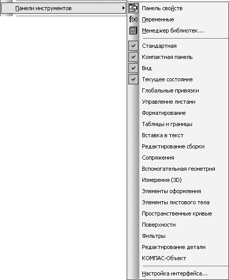 Все остальные пункты подменю Панели инструментов – команды-флажки. С их помощью можно отображать и закреплять в неклиентской области окна любые панели инструментов. По умолчанию всегда включены четыре панели: Стандартная, Компактная панель, Вид и Текущее состояние (эти панели необходимы при работе с любым типом документов). Получить доступ ко всем остальным панелям можно и с помощью компактной панели. Однако иногда панели инструментов, которые используются особенно часто, очень удобно держать под рукой, а не щелкать каждый раз на кнопках переключения компактной панели. Например, при частой работе с графическими документами удобно, чтобы на экране постоянно присутствовала панель инструментов Глобальные привязки. С другой стороны, большое количество закрепленных панелей инструментов затрудняет работу, загромождая окно программы и уменьшая область представления документа. Поэтому принимайте решение о том, какие панели оставлять видимыми, а какие прятать, в зависимости от конкретных задач.