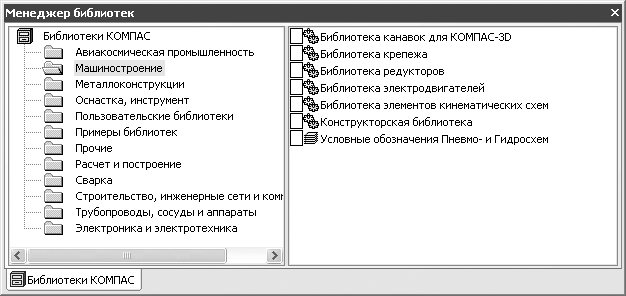 Команда Менеджер библиотек подменю Панели инструментов открывает или закрывает одноименную панель (рис. 1.14), служащую для подключения и управления прикладными библиотеками системы КОМПАС. В этом окне содержится список всех приложений, установленных вместе с программой.