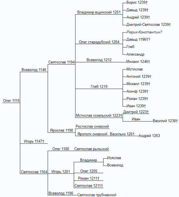 Следует заметить, что северские Святославичи для черниговских Всеволодовичей занимали примерно ту же позицию, что и суздальские Юрьевичи для волынских и смоленских Мстиславичей: поздние дети младшей линии оказывались младше возрастом, чем их племянники из старшей линии, переживали их и оставляли их потомков изгоями. Подобное же мы должны наблюдать и у Ольговичей.