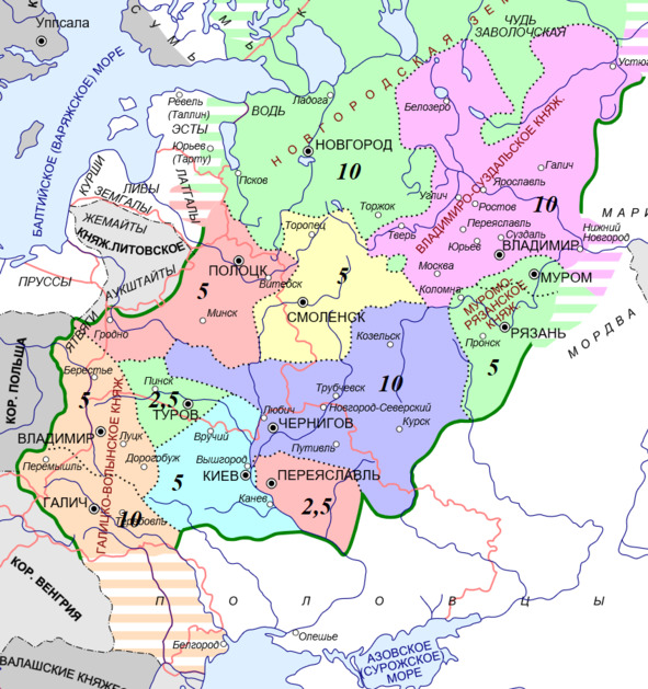 На рис.1 показана реконструкция всех сил каждого русского княжества на основании сопоставления сведений русских летописей, хроник Генриха Латвийского и Яна Длугоша о численностях русских войск соответственно в 1173, 1223 и 1205 годах, и известного примерного соотношения сил княжеств. Реконструкция, которая при применении к военному сбору в каждой междоусобице всякий раз подтверждается.
