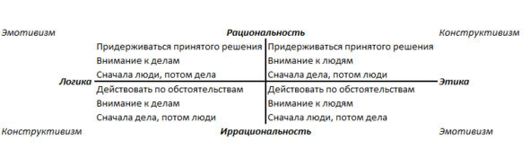 Функции Эго задают ценности квадр. В Эго каждого ТИМа стоят две функции: одна рациональная (логика или этика) и одна иррациональная (сенсорика или интуиция). Рациональным (ниже «придерживаться принятого решения») или иррациональным («действовать по обстоятельствам») ТИМ считается по первой функции. Логиком («внимание к делам») или этиком («внимание к людям») человек является по рациональной функции в Эго.