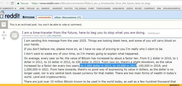 Письмо наделало шуму, быстро разлетелось по профильным и не только ресурсам, его скопировали сотни сайтов и перевели почти на все языки мира. Поговаривают также, послание из будущего шутки ради было написано тем же человеком (или группой людей), который скрывается под именем Сатоши Накамото – создателя первого протокола для криптовалют.