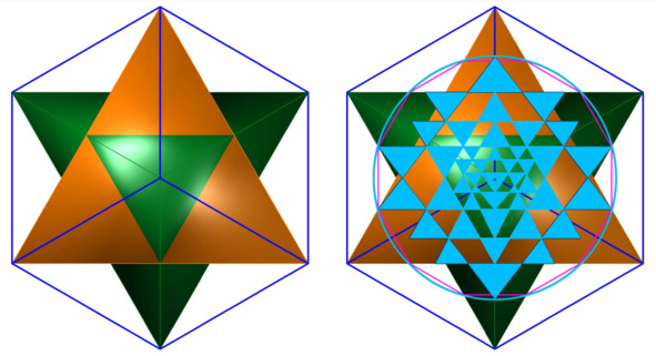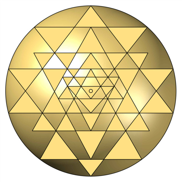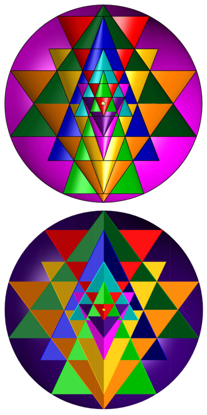 Всем знакомое изображение Шри Янтры из девяти пересекающихся треугольников является плоскостным и двумерным (рис. 1, 3). Представление Шри Янтры в 3D, в трёхмерном объёме, интересная и захватывающая тема. Примеры таких изображений, как традиционные: сферическая и пирамидальная формы, а также другие возможные варианты компоновки из тетраэдров, пирамид и конусов даны в главе «Шри Янтра 3D – объёмные решения», на рис. 9 представлены некоторые из них. Одной или несколькими проекциями, или сечениями предложенных объёмных моделей является традиционное двумерное изображение Шри Янтры одной из моделей.
