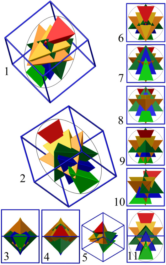 Рис. 11. Объёмная модель Шри Янтры, вписанная в куб, построенная по двум одинаковым линейным проекциям – горизонтальной и вертикальной: 1 – аксонометрия (вид сверху); 2 – аксонометрия (вид снизу); 3, 4 – проекции, параллельные диагональной секущей плоскости куба; 6 – план (вид сверху); 7 – план (вид снизу); 8 – фронтальная проекция (вид спереди); 9 – фронтальная проекция (вид сзади); 10 – вид сбоку; 11 – проекция, параллельная диагональной секущей плоскости куба
