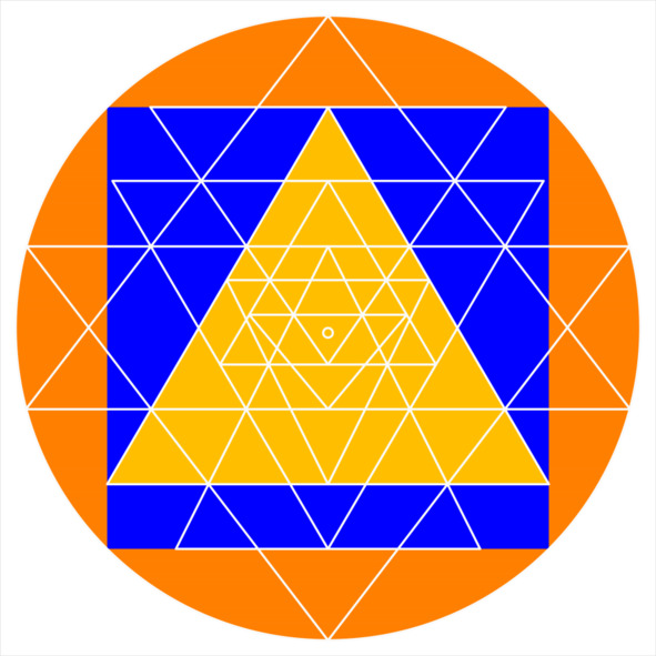 Рис. 2. Шри Янтра. Схема построения центрального ядра по алгоритму №1 на базе квадрата и вписанного в него треугольника