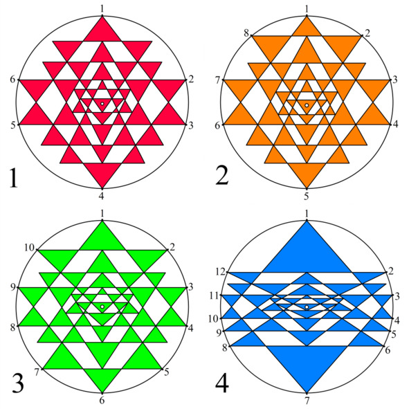 Рис. 8. Модели Шри Янтры, классифицированные по количеству вершин треугольников, касающихся окружности: 1 – шесть; 2 – восемь; 3 – десять; 4 – двенадцать