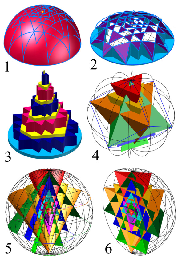 1 – сферическая; 2 – купольная; 3 – пирамидальная (Меру); 4 – из пирамид на базе Меркабы (основание треугольник), 5 – из конусов, 6 – из пирамид (основание квадрат)