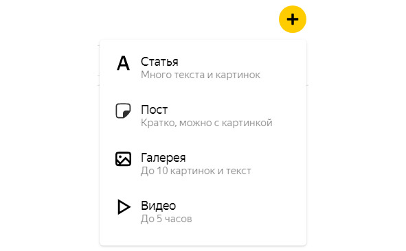 В личном кабинете автора в «Дзен-студии» можно создавать четыре вида публикаций: статья, пост, фотогалерея, видео, что делает Дзен универсальной «3-в-1» блог-платформой, объединившей возможности LiveJournal + YouTube + Instagram.