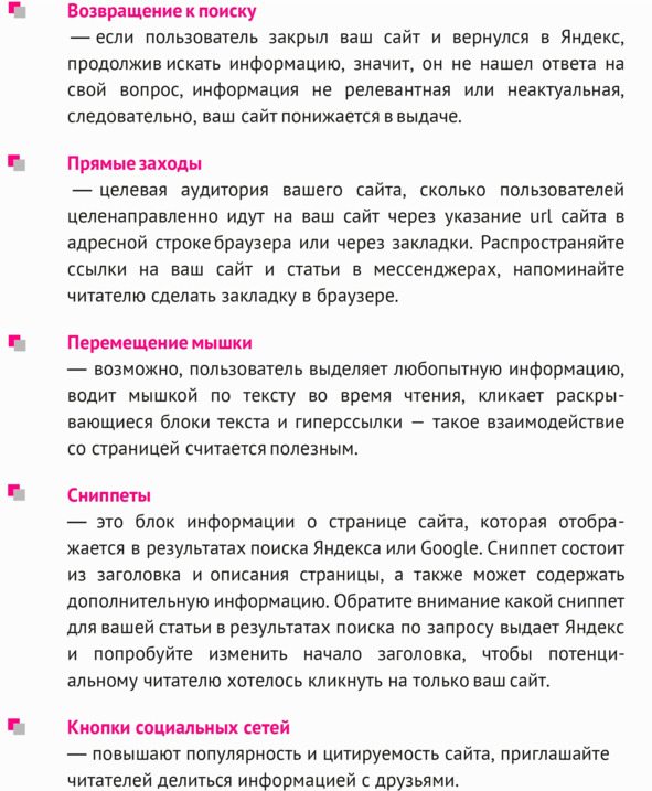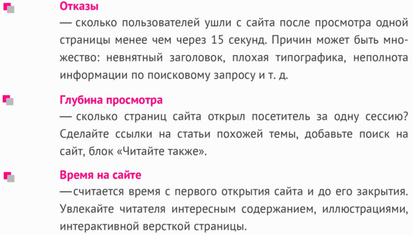 Есть несколько типов поведенческих факторов ранжирования, на которые редактору текста необходимо влиять, увлекая пользователя в содержание, стимулируя к взаимодействию со страницей: