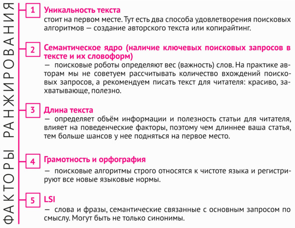 Для правильной оптимизации статьи вам, как автору и редактору текста, нужно знать основные факторы ранжирования и влиять на них: