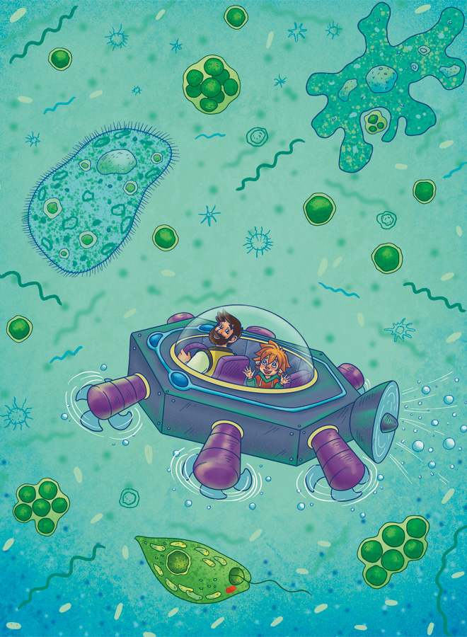 – Теперь вокруг нас много причудливых существ – это одноклеточная жизнь. Здесь разные бактерии, зелёные и красные водоросли, а ещё простейшие.