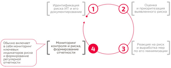 Мониторинг риска ИТ – это выработка ключевых индикаторов риска, наблюдение и оценка эффективности процессов и процедур, направленных на снижение риска, актуализация и обновление профиля рисков (перечня рисков, присущих ИТ).