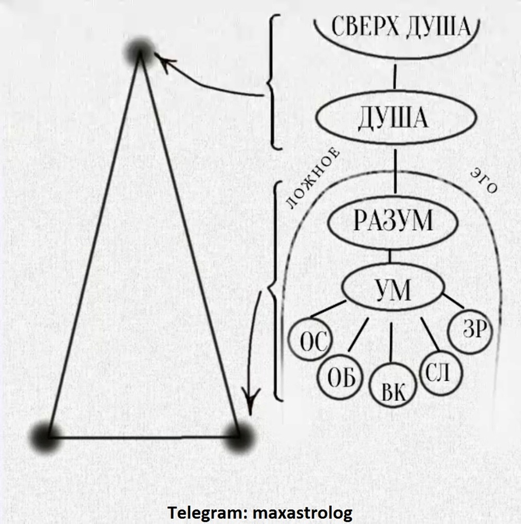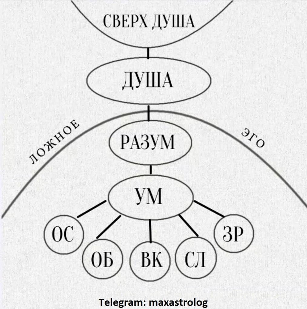 Перед нами изображение уровней сознания человека. Такую модель предлагает ведическая философия. Внизу расположены органы восприятия: осязание, обоняние, вкус, слух и зрение – их природа подобна «магниту» и «пылесосу», они липнут ко всему и втягивают всё без разбора. При этом, выше идёт система двойного фильтра: все звуки, вкусы, запахи, картинки и ощущения попадают в ум – его природа иррациональна, он принимает всё приятное, а неприятное отвергает. То что принимает ум попадает в разум – его природа рациональна, он принимает всё полезное, а вредное отвергает. Критерии приятного, неприятного, полезного и вредного хранятся в «капсуле – оболочке», которая называется «ложное или субъективное эго». Она как «капсула» – хранит гороскоп человека на данное воплощение, а как «оболочка» – отделяет материальную природу от духовной, потому что гороскоп этот кармический и может реализоваться только в материальном мире.